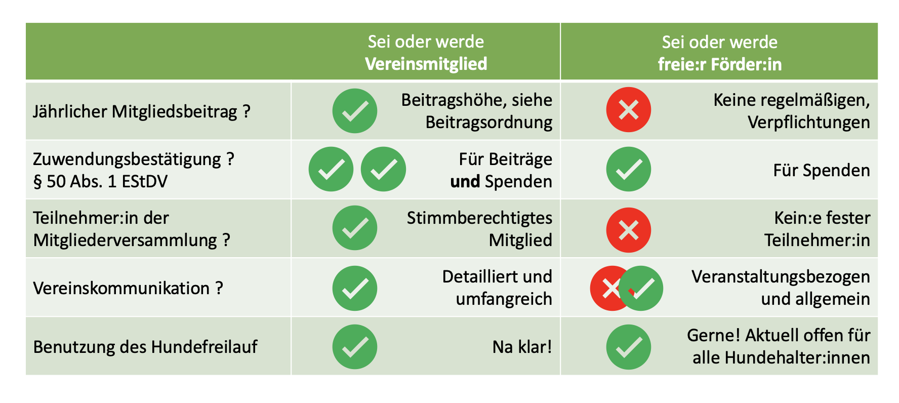 Grundsätzlich hast du zwei gute Möglichkeiten. Zum einen freuen wir uns natürlich über deine Mitgliedschaft. Alternativ kannst du natürlich auch freie Fördererin oder Förderer werden. Die folgende Abbildung stellt dir die Vorteile kurz dar: